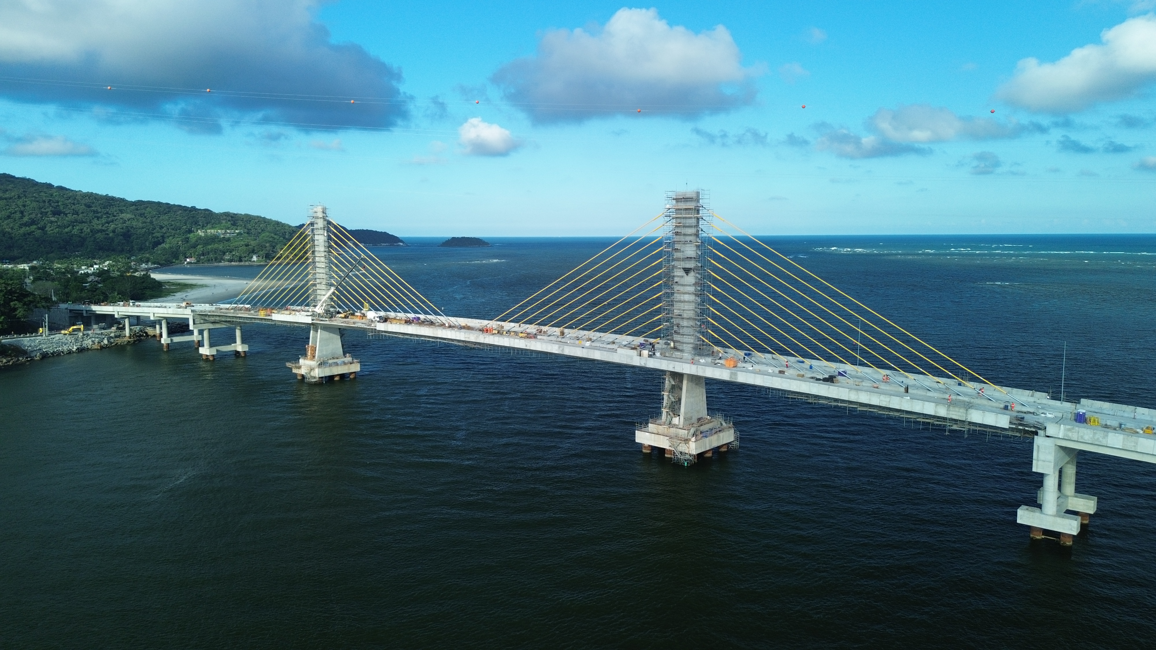 Os estais são cabos de aço de alta resistência que conectam o tabuleiro da ponte aos mastros e têm a função de sustentar a estrutura. Eles absorvem e distribuem as forças geradas pelo peso da ponte e pelo tráfego, transferindo essas cargas para as torres e, posteriormente, para as fundações. As torres de sustentação, também chamadas de mastros, têm cerca de 40 metros de altura e são responsáveis por ancorar os cabos que sustentam o trecho central. Ao todo, foram instalados 12 pares de estais em cada um dos mastros.